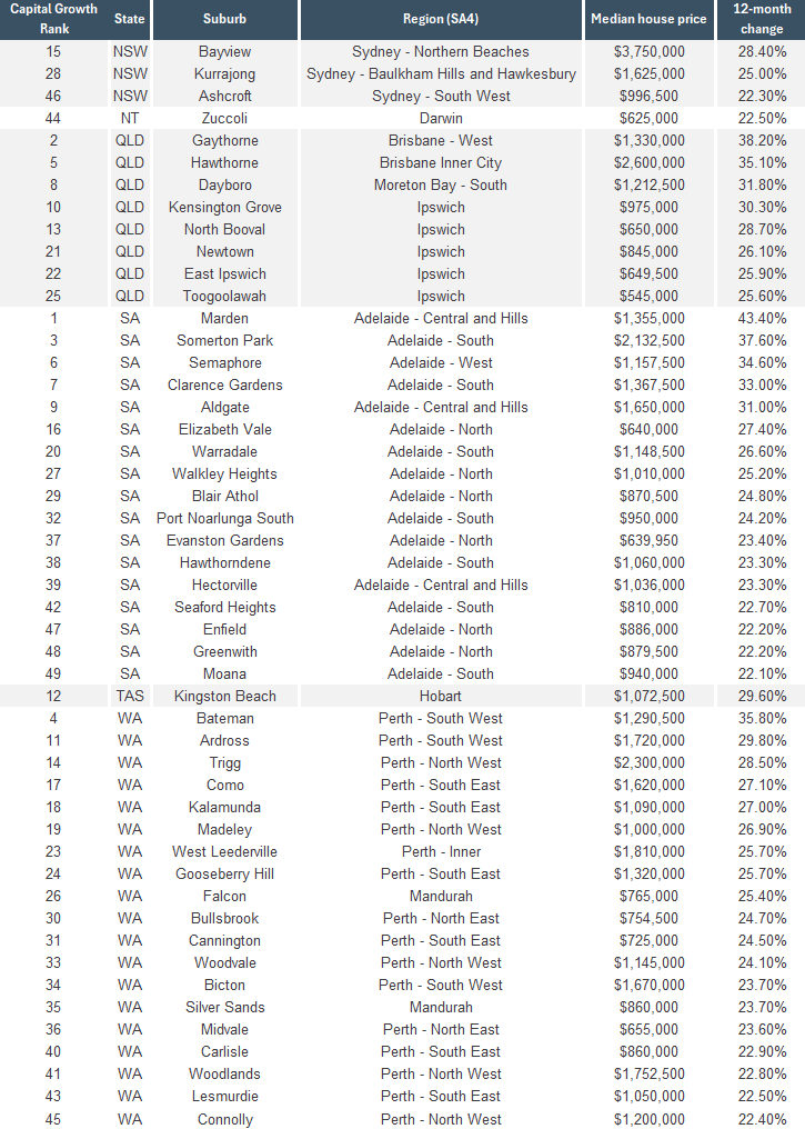 Here are list of 49 suburbs across Australia sorted by state, that had capital growth of more than 3 times (22% +) the national growth last 12 months